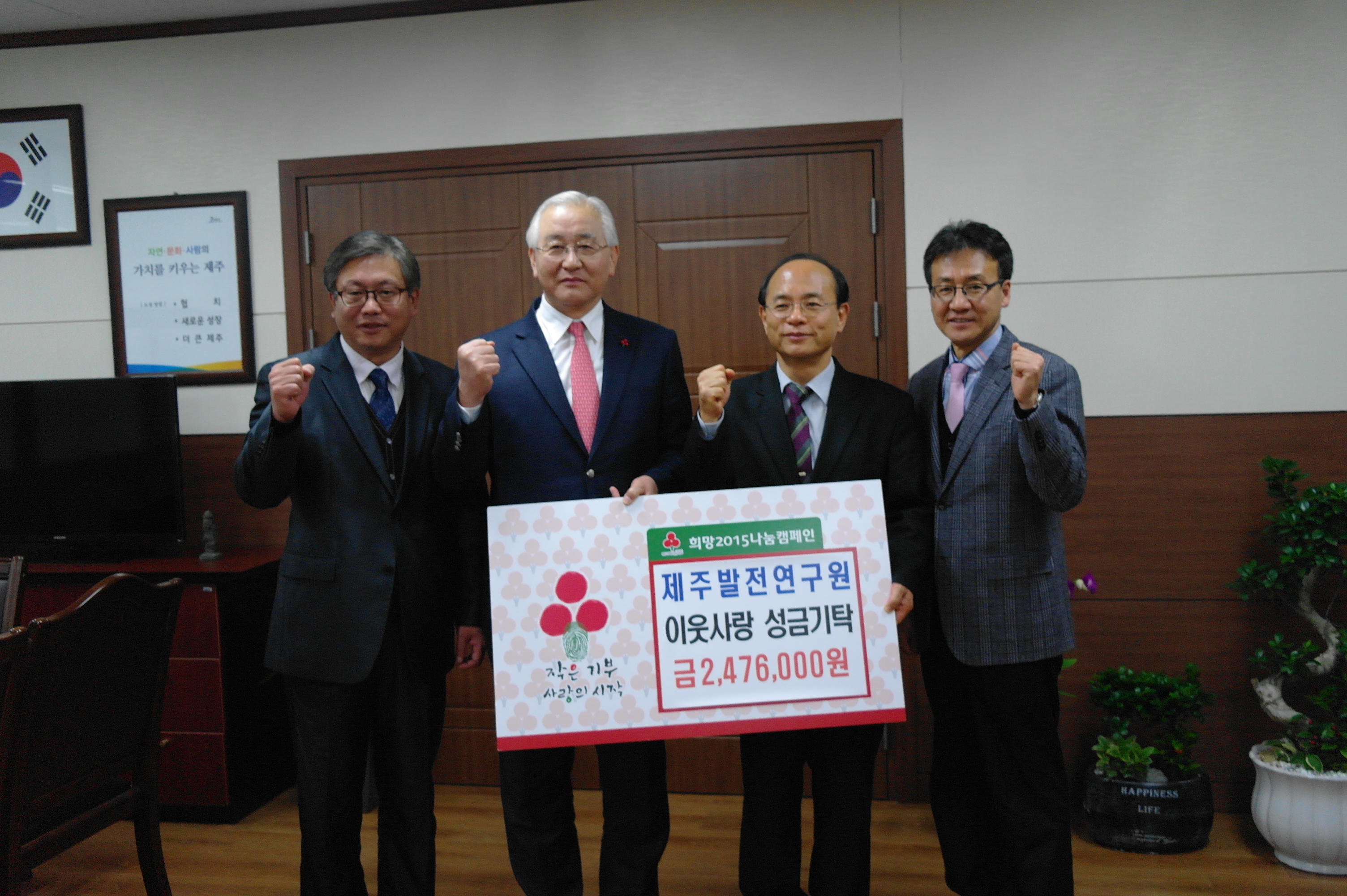 제주발전연구원(원장 강기춘)은 전직원의 급여의 일부를 모아 마련한 이웃사랑 성금 2,476,000원을 12월24일 제주사회복지공동모금회에 기탁했다.