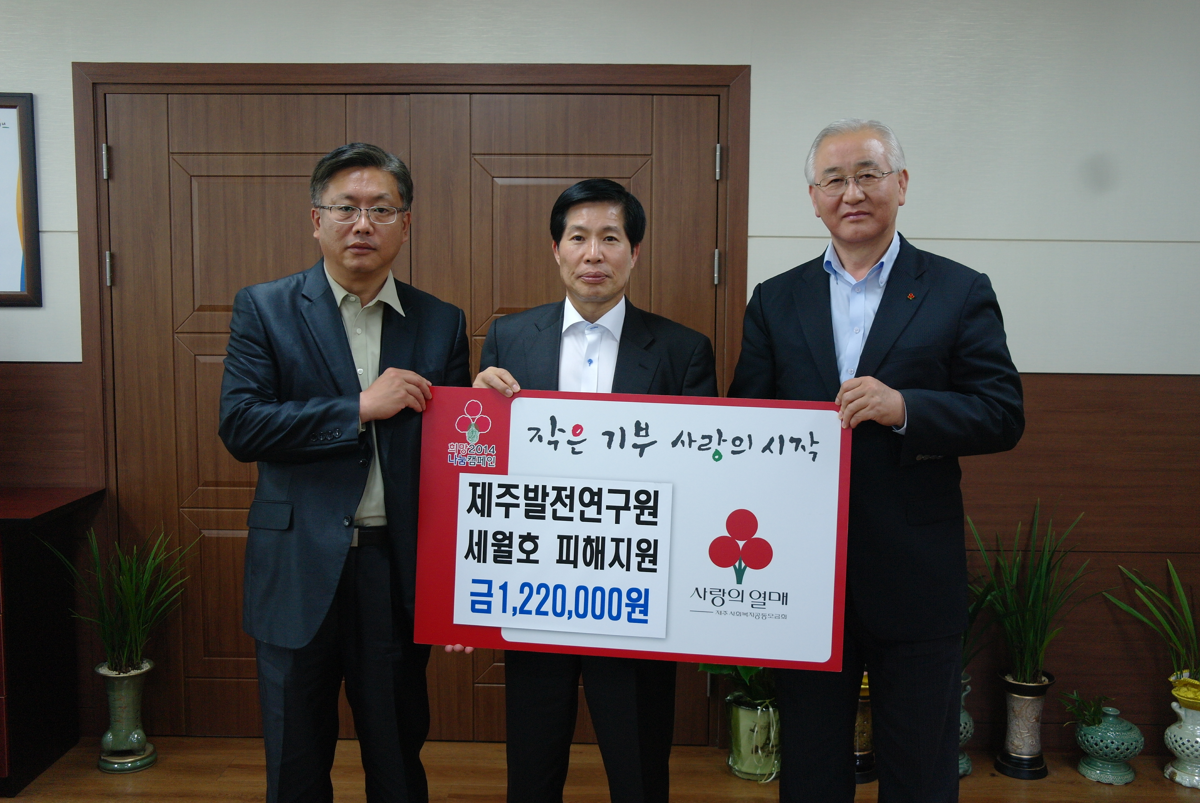 제주발전연구원 전직원은 세월호 침몰 사고로 인해 시름에 빠져있는 피해자와 그 가족들을 위해 위로의 마음을 전달하고자 자율적으로 모금한 성금을 제주사회복지공동모금회를 통해 전달했다.